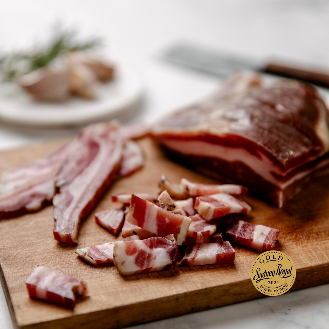Pancetta is a salt-cured pork belly which can be eaten either cooked or uncooked. Often used to add depth to soups and pasta. A beautiful looking and delicious add-on your favourite salad or antipasto.