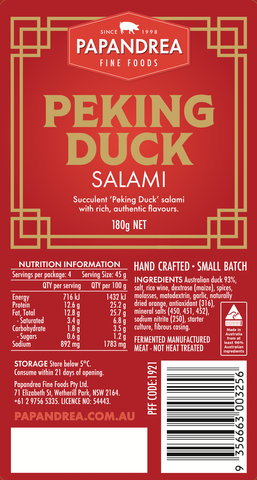 Introducing Papandrea Peking Duck Salami – premium Australian duck infused with the iconic flavours of Chinese Five Spice and Shaoxing Wine.